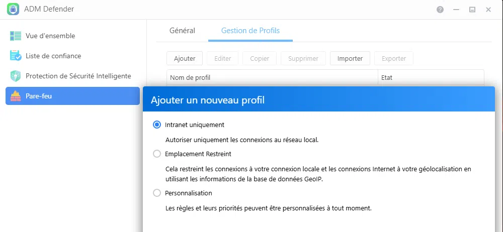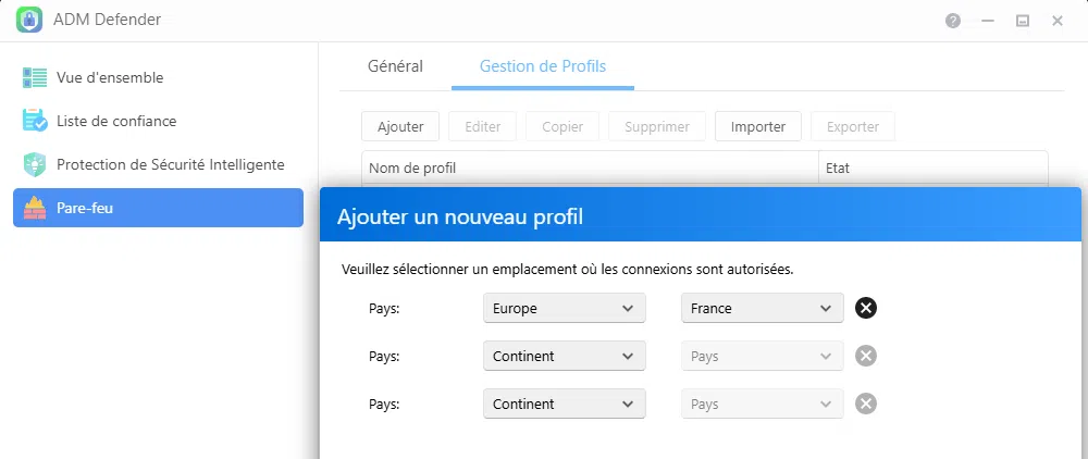 Ces profils prédéfinis simplifient la configuration du pare-feu pour les utilisateurs qui n'ont pas de compétences techniques spécifiques. Par exemple, cela permet, en quelques clics, d'autoriser les connexions uniquement depuis la France (vous bloquez ainsi les attaques en provenance de l'étranger).