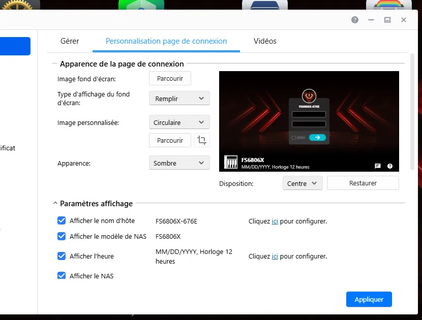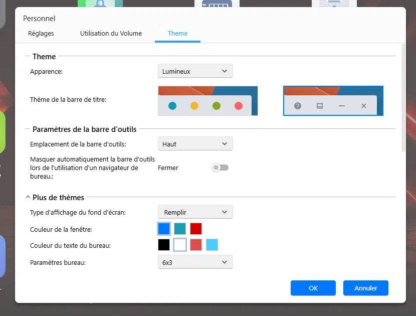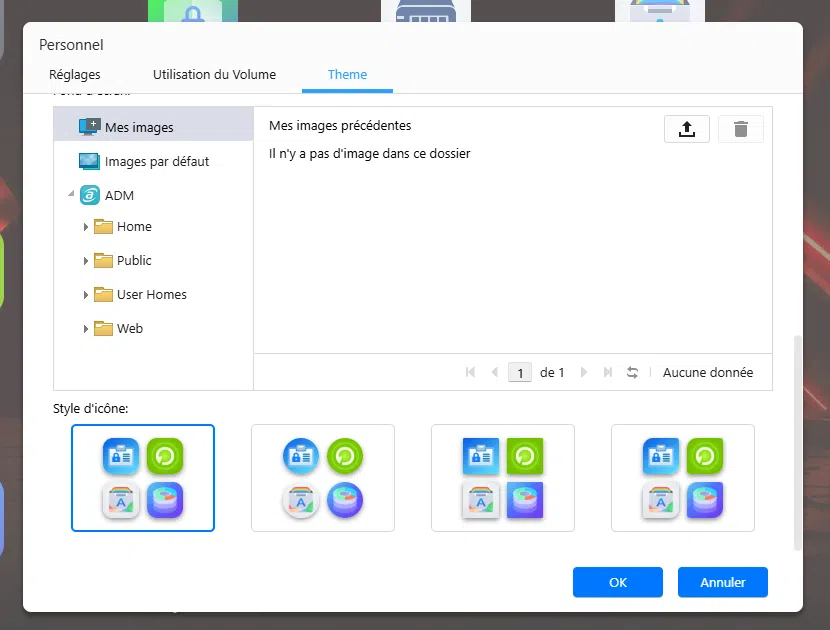 L'utilisateur peut personnaliser la page de connexion du NAS, mais aussi son espace personnel. Il peut choisir son propre fond d'écran, modifier la disposition des éléments sur le bureau, changer les couleurs des boutons ou encore modifier le type d'icônes.