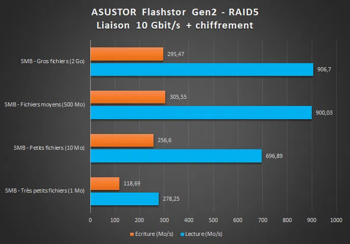 Avec une connexion 10 Gbit/s, les débits s'envolent de façon notable ! Sur les traitements avec des gros fichiers, le benchmark mentionne 1 Gbit/s en écriture !