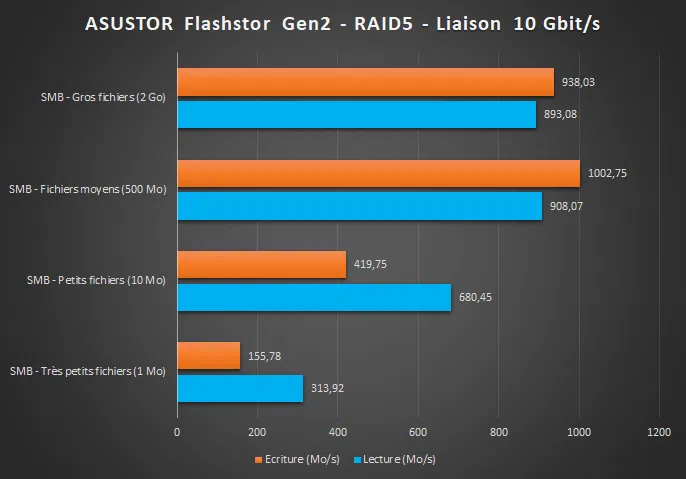 Remarque : sur son site, ASUSTOR annonce un débit de 1 179 MB/S en lecture et 1 181 MB/S sur un volume en RAID-5 et un lien réseau en 10 Gbit/s. Il s'agit de tests effectués par ASUSTOR en condition optimale.