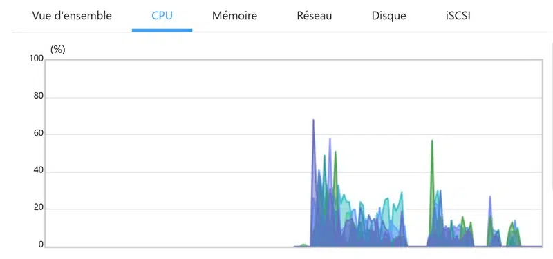 Pendant le second test de performance effectué avec un partage chiffré, j'ai observé la charge globale du NAS. Les graphes ci-dessous montrent que le NAS réagit parfaitement à la sollicitation puisque la RAM consommée est de 8%. Le CPU quant à lui montre des signes de montée en puissance lorsqu'un cycle du benchmark est actif (avec chaque lot de fichiers, d'où les 4 cycles). Nous pouvons voir que la consommation moyenne est inférieure à 20%. Par ailleurs, il est à noter que ce NAS est extrêmement silencieux, même lorsqu'il est en pleine charge.