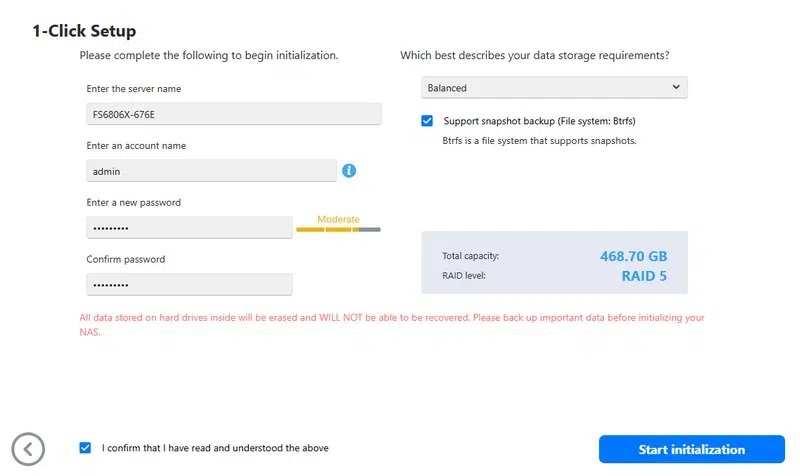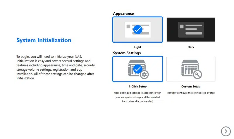 La mise en route se fait en quelques clics. Deux options s'offrent à l'utilisateur : une configuration rapide et guidée pour les débutants, et une configuration personnalisée pour les utilisateurs expérimentés. La méthode présentée ci-dessous est appelée "1-Clic", où le processus est simplifié. Tous les choix nécessaires pour initialiser le NAS sont regroupés sur une seule page. Je vous recommande de cocher l'option "Support snapshot backup (file system : Btrs)" pour disposer de fonctions avancées pour la protection des données.