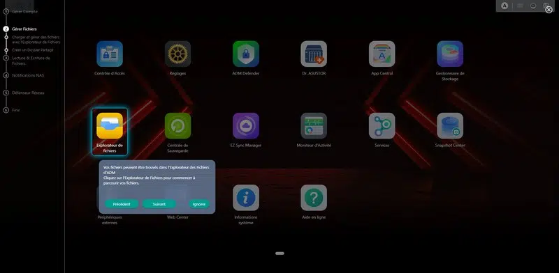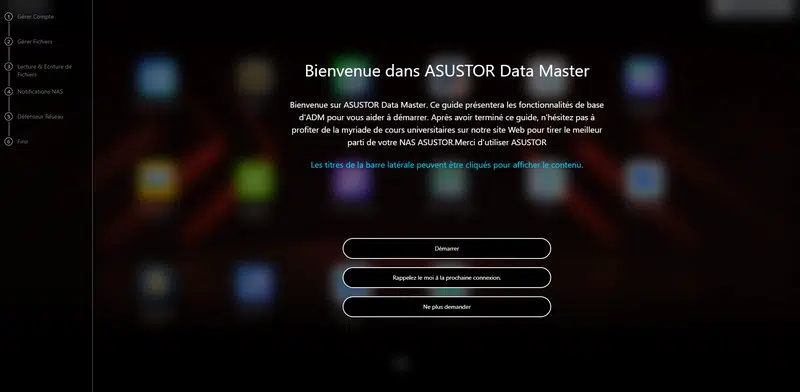 Lors de la première connexion, un assistant s'affiche pour vous souhaiter la bienvenue, et surtout, vous guider ! En effet, il est conçu pour aider les utilisateurs à configurer et utiliser efficacement leur NAS. Tel un assistant virtuel, il vous explique comment utiliser l'interface d'ADM. C'est plutôt intéressant si vous faites vos premiers pas avec un NAS ASUSTOR.