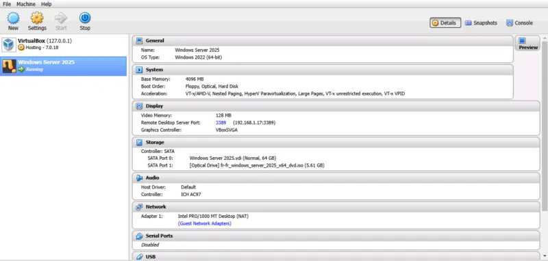Je suis parvenu, sans difficulté particulière, à installer une machine virtuelle sous Windows Server 2025. La virtualisation est donc une réalité avec ce NAS.