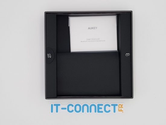 Dans l'élégante boîte, les écouteurs sont parfaitement rangés et en place, alors qu'en dessous nous retrouvons les autres éléments de la boîte, à savoir : la notice, le câble de rechargement et des embouts de remplacement pour les oreillettes. On remarque un soin particulier sur la présentation des produits de la part d'AUKEY sur sa série Key Series.
