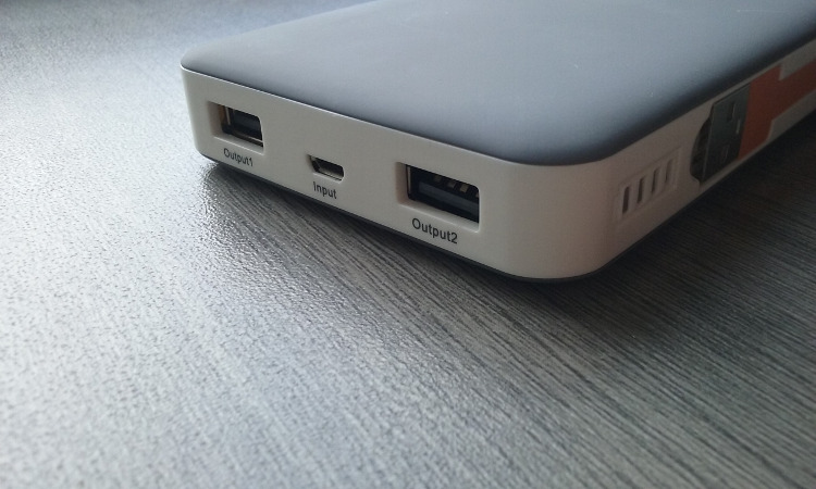 En façade, on voit donc le port microUSB "input" permettant de recharger la PowerBank et 2 ports USB "Output 1" et "Output 2" permettant de recharger déjà deux appareils simultanément :