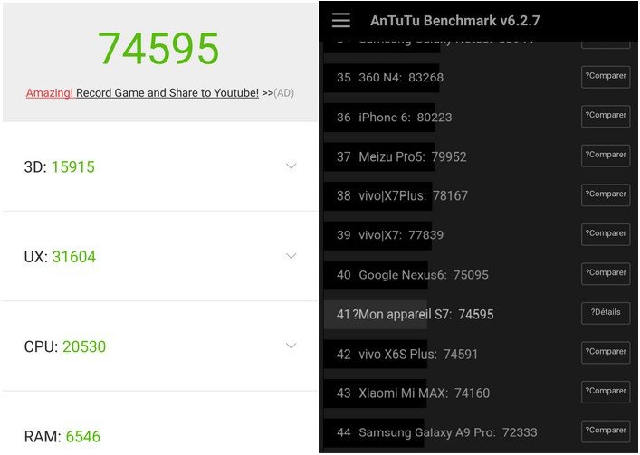 Avec 74 595 points au compteur, l'Elephone S7 obtient un bon score sur le benchmark AnTuTu qui le classe sur le papier à un niveau égal au Nexus 6.