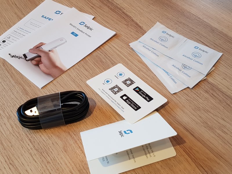 Nous retrouvons les éléments suivants : une cartouche (noire), un câble USB-C, un capuchon pour l'imprimante, des lingettes nettoyantes (pour la tête d'impression), ainsi que différents documents dont une notice et une carte de garantie.