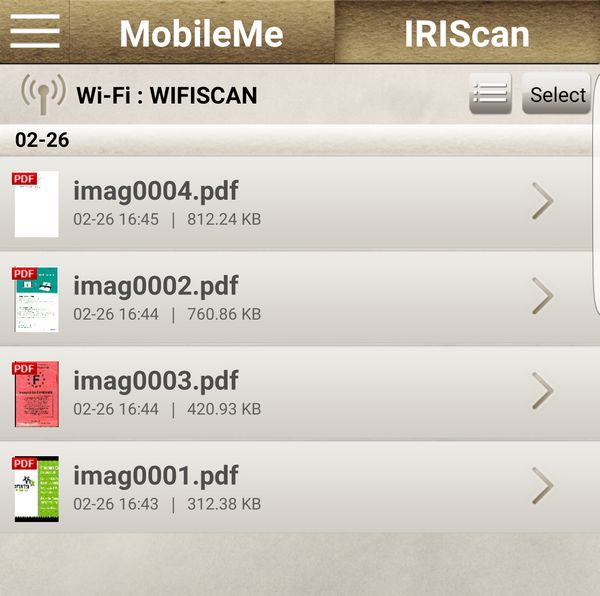Après avoir établit une connexion Wi-Fi entre le smartphone et le scanner, on peut accéder aux fichiers stockés sur la carte mémoire pour les gérer :