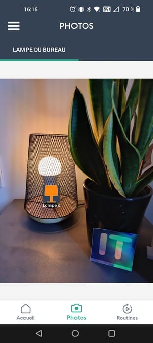 Tout d'abord, le mode photo. Il consiste à prendre une photo de l'ampoule dans son environnement (comme ici, dans mon bureau) afin de positionner sur la photo un icône correspondant à cet équipement. Ainsi, dans l'application si l'on appuie sur l'ampoule directement sur la photo, on est redirigé sur la gestion de cet équipement !