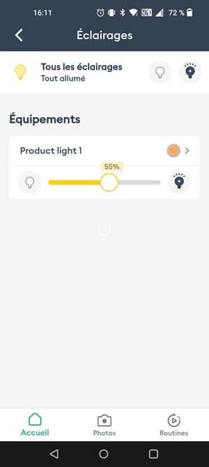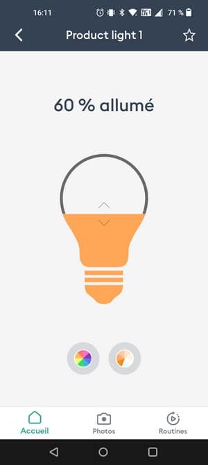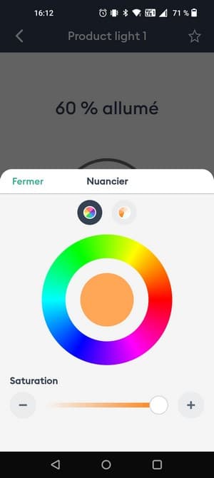 Sans rentrer dans la gestion de l'ampoule, on peut accéder à quelques actions pour l'allumer, l'éteindre ou gérer l'intensité de l'éclairage. Ensuite, si l'on sélectionne l'ampoule, on accède au nuancier pour choisir une couleur précise, en jouant sur la saturation, pour trouver la couleur correspondante à ses envies. On peut faire la même chose pour avoir du blanc froid ou du blanc chaud. L'intensité de l'éclairage se gère d'un simple glissement de doigt vers le bas ou vers le haut pour diminuer ou augmenter l'intensité. Il n'y a pas de système d'ambiance, comme un mode "lecture" ou un mode "concentration" comme on peut retrouver chez Philips Hue, par exemple.