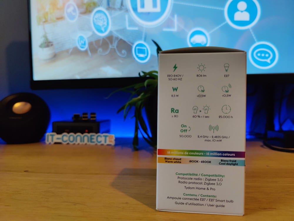 Elle est compatible exclusivement avec les deux nouvelles box pour maison connectée : Tydom Home (version boîtier) et Tydom Pro (version pour tableau électrique). Je vous recommande de lire mon article au sujet de la nouvelle box Tydom Home. Pour ses ampoules de la gamme Easy, Delta Dore propose un tarif unique : 34,90 euros par ampoule, que ce soit pour une ampoule au format E27, E14 ou GU10. Dans cet article, c'est le modèle au format E27 qui est présenté.