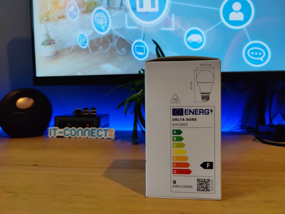 Sur la boîte de l'ampoule Easy, j'ai apprécié qu'il y ait de nombreuses informations techniques ! Au-delà d'apprendre qu'elle appartient à la classe énergétique F (normal pour une ampoule connectée, car elle consomme toujours un minimum d'électricité), on apprend beaucoup de choses intéressantes :