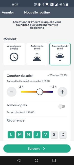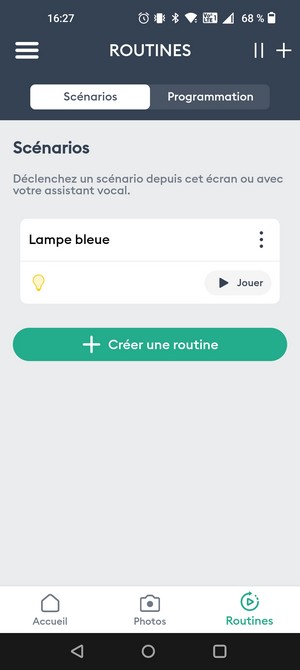En ce qui concerne les routines, il y a d'une part les scénarios et d'autre part la programmation. Un scénario se déclenche à partir du smartphone tandis que la programmation permet de planifier des actions qui vont se déclencher automatiquement. Par exemple :