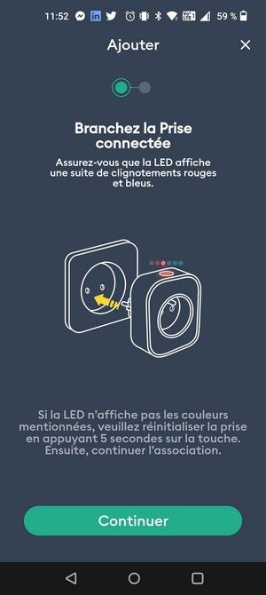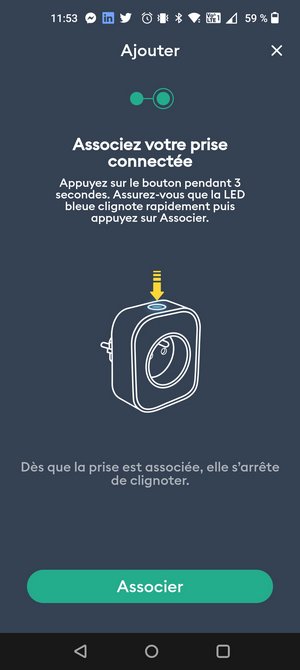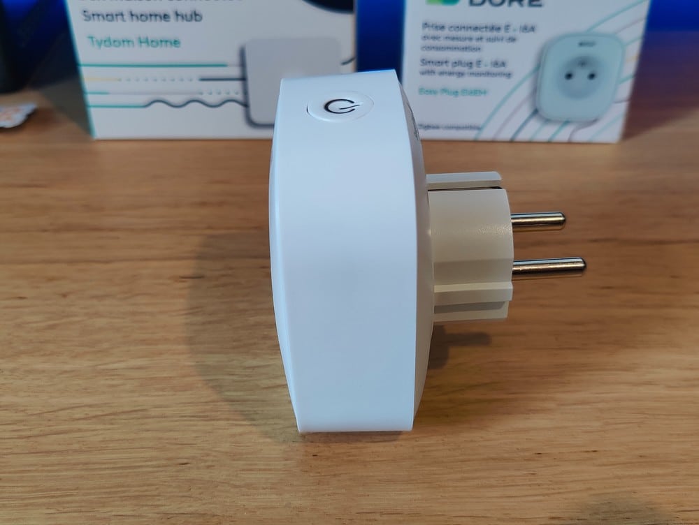Quelques étapes suffisent pour associer la prise connectée à sa box Tydom. Le bouton présent sur le dessus de la prise connectée sert à basculer l'appareil en mode association. Par la suite, ce bouton physique sert à allumer ou éteindre la prise sans pour autant la débrancher du mur. Lorsque la prise est allumée, il y a un rétroéclairage bleu, sinon, le bouton est éteint.