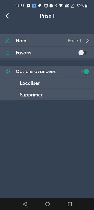 Note : dans l'application, les réglages avancés et l'option pour changer le nom de l'appareil ne sont pas situés au même endroit que l'interface d'utilisation de la prise connectée en elle-même. C'est un coup à prendre avec l'application Tydom.