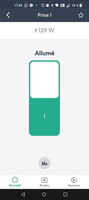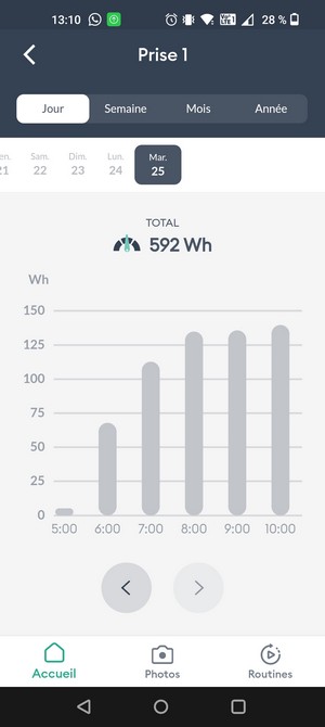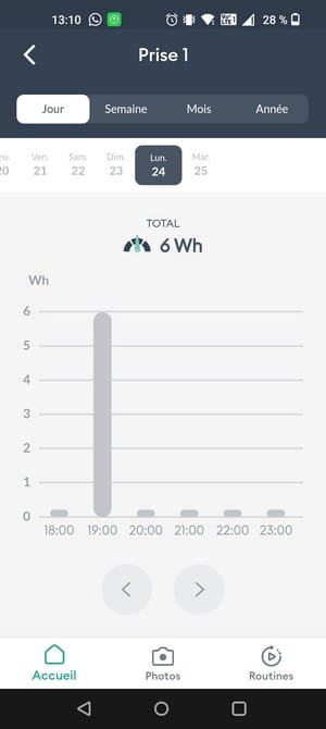 En matière de fonctionnalités avancées, nous avons les sections "Photos" et "Routines", ainsi que l'historique de la consommation.