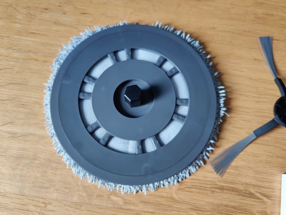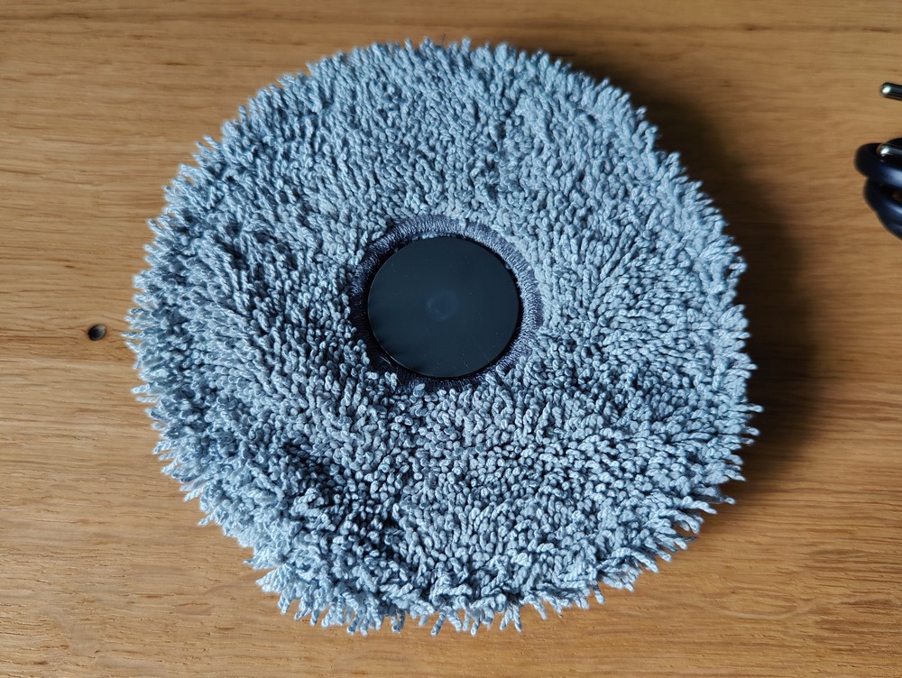 Les deux serpillières de 13 cm de diamètre doivent être positionnées sur le robot, côte à côte, sur les emplacements prévus. Elles sont là pour remplacer les habituelles serpillières en microfibre, en assurant un nettoyage grâce aux rotations (et au robot qui gère son poids pour faire appuie sur le sol) : 180 rotations par minutes. Comme je le disais, elles sont lavables : il suffira de les retirer du support plastique pour les laver et les sécher avant de les remettre en place.