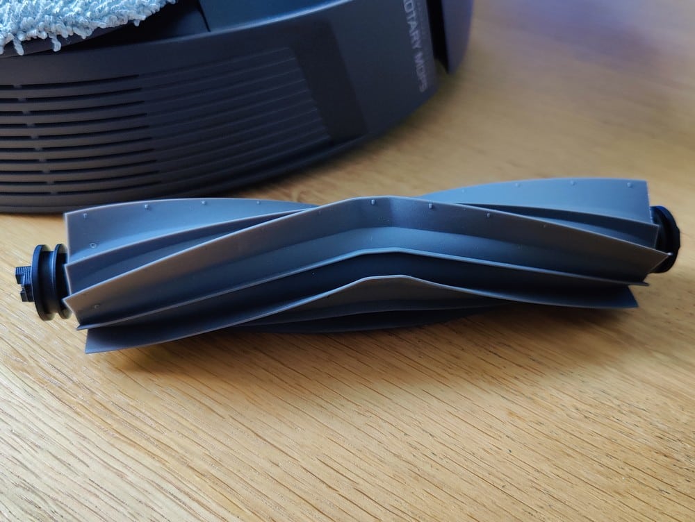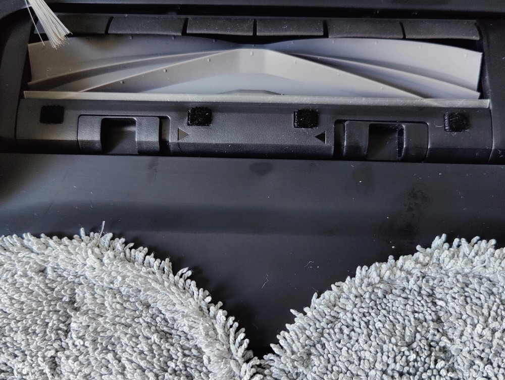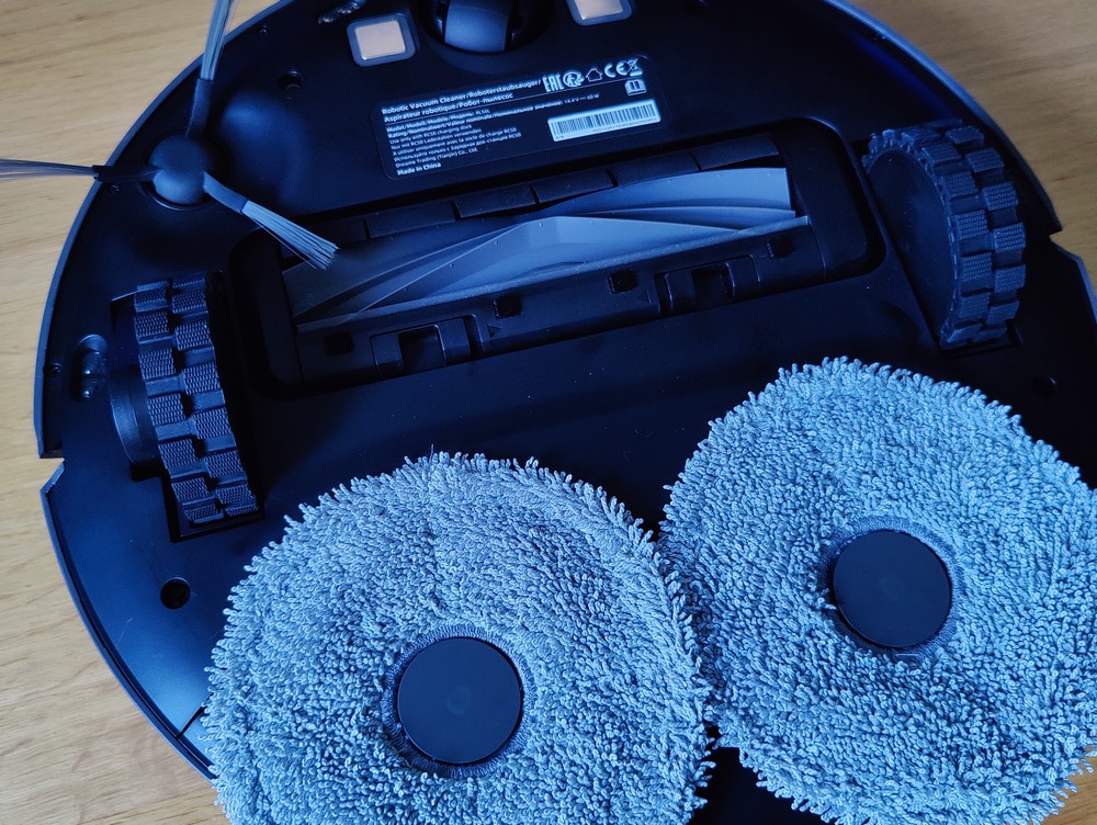 Le système de serpillières rotatives est efficace dans le sens où il permet de simuler un frottement sur le sol. Pour le lavage, le robot doit gérer les surfaces : lorsqu'il passe sur un tapis ou de la moquette, il soulève et arrête ses deux brosses rotatives, ce qui est pertinent.