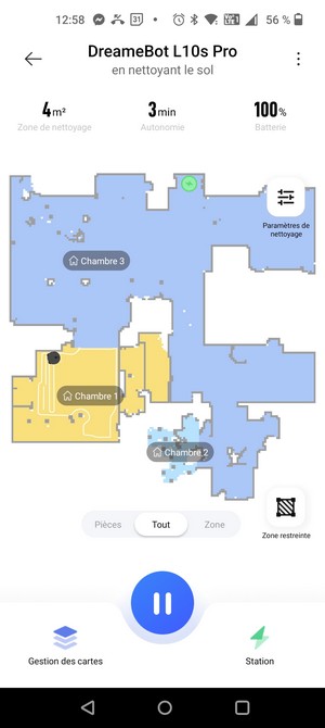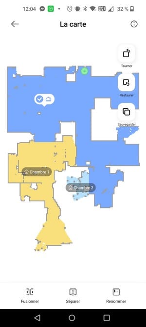 Au premier lancement, le robot réalisera une carte de votre logement, dans le but de déterminer des pièces (avec une fonction pour chaque pièce). Sur cette carte, représentative de votre logement, vous pouvez visualiser le parcours exact effectué par le robot. C'est l'occasion de constater que le robot ne navigue par n'importe comment, et qu'il y a une logique dans ses déplacements. Autrement dit, il délimite une zone et effectue le nettoyage avec des allers-retours, de manière à nettoyer l'intégralité de la zone en un minimum de temps.