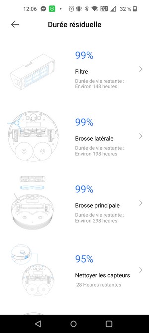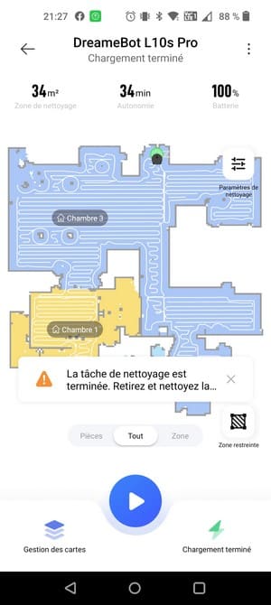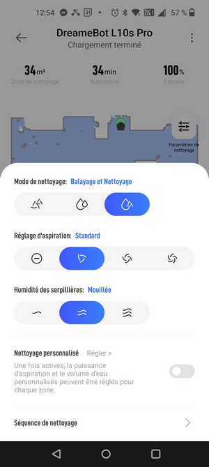 Dreame annonce une autonomie de 150 minutes (soit 2 heures 30), mais évidemment cela dépend des paramètres de nettoyage : plus le robot aspire fort, plus l'autonomie sera réduite. Avec le mode d'aspiration fort, le robot est parvenu à nettoyer pendant 166 minutes avant qu'il ne reste plus que 15% de batterie et qu'il décide de retourner à sa base ! Je l'ai lancé en boucle à plusieurs reprises, jusqu'à ce que la batterie soit épuisée : il n'était pas loin d'enchaîner 4 nettoyages complets.