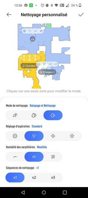 En complément, cette carte permet aussi de définir des paramètres de nettoyage par pièce. Par exemple, nettoyer 2 fois la cuisine avec l'aspiration au maximum et nettoyer 1 fois la chambre avec l'aspiration normale. Ainsi, vous pouvez accentuer le nettoyage dans les pièces où il y a potentiellement plus de miettes, etc. Bien sûr, vous avez aussi la possibilité de définir des paramètres de nettoyage globaux pour l'intégralité de la surface (mode de nettoyage, puissance d'aspiration, débit d'eau).