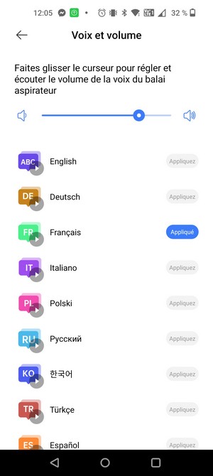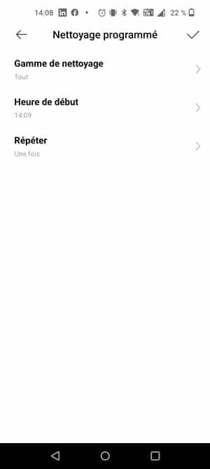 - Programmation du nettoyage (complet ou de certaines pièces), selon un planning (heure de début + sélection des jours)