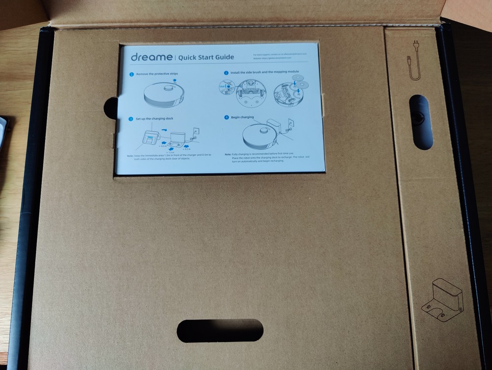 Le robot est accompagné par un lot d'accessoires comprenant deux serpillières rotatives pour le lavage du sol, une brosse latérale, un outil de nettoyage, ainsi qu'une station de charge accompagnée par son câble d'alimentation. En complément, Dreame a inclus une notice d'utilisation et un guide de démarrage rapide. La brosse principale ainsi que les différents réservoirs sont déjà en place sur le robot. Il est à noter qu'il y a pas d'accessoires de rechange (pas de filtre, pas de brosse, etc.), ce qui m'a un peu déçu.
