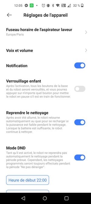 - Mode "Ne pas déranger" pour que le nettoyage ne soit pas effectué sur une plage horaire précise (plage horaire unique pour tous les jours)