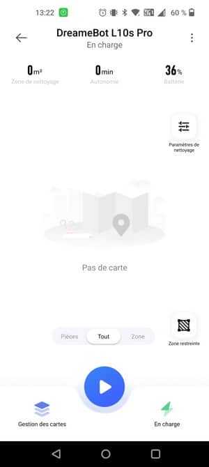 Le bouton "Play" en bas au centre de l'application permet de déclencher un nettoyage selon vos paramètres : nettoyage complet, nettoyage d'une ou plusieurs pièces, ou nettoyage d'une zone (à dessiner sur la carte).