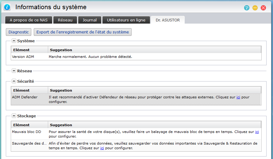 En fait, Dr. Asustor effectue un diagnostic du système et génère un rapport afin de vous aider dans la configuration et la maintenance du NAS. Voici un aperçu de l’interface :