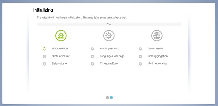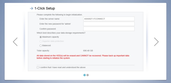 La mise en route se fait très rapidement et simplement grâce à l’assistant « One-Click ». Il suffit d’indiquer un nom pour le NAS, un mot de passe pour le compte « admin » et de configurer l’espace de stockage selon deux modes prédéfinis.