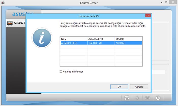 - Vous ne connaissez pas l’adresse IP, alors vous installez « ASUSTOR Control Center » disponible sur le CD fournit avec le NAS, et vous pourrez détecter le NAS sur le réseau, comme ceci :