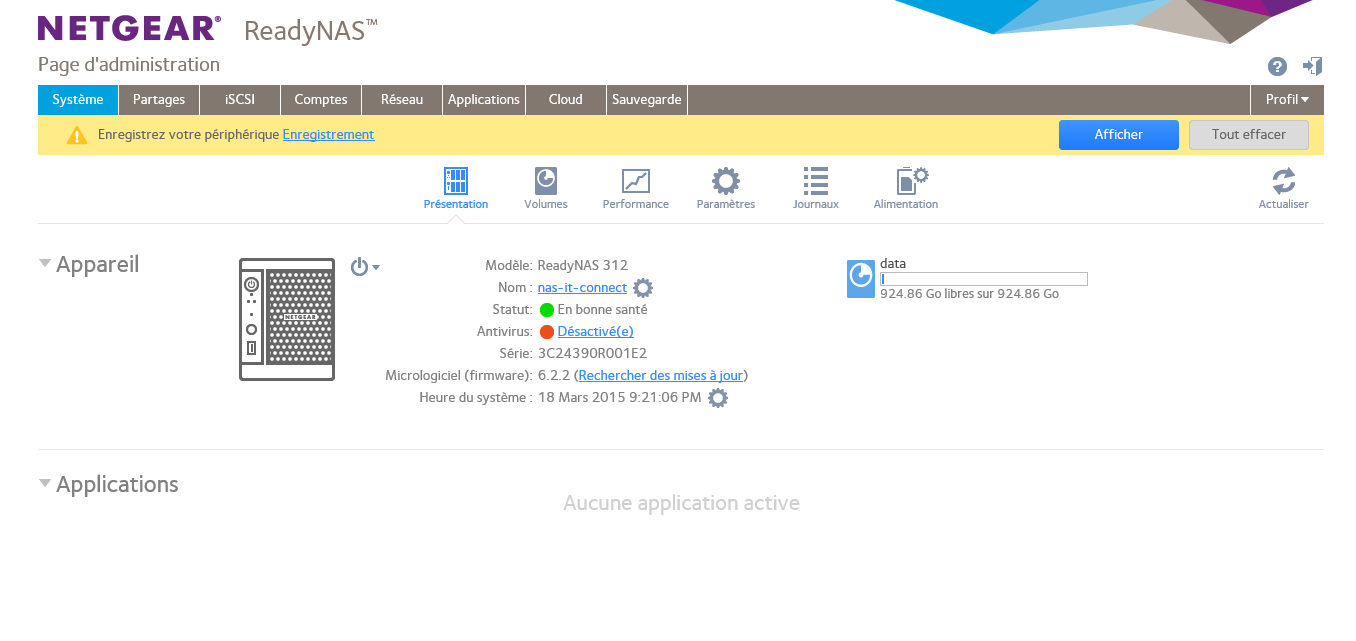 Je ne suis pas si sûr, du moment que ça réagit bien, que c'est fluide, intuitif et fonctionnel, ça pourra en satisfaire plus d'un. Le design est sobre, et on retrouve une navigation en menu qui permet l'accès à différentes catégories de fonctionnalités et options : Système, Partages, iSCSI, Comptes, Réseau, Applications, Cloud, et Sauvegarde.