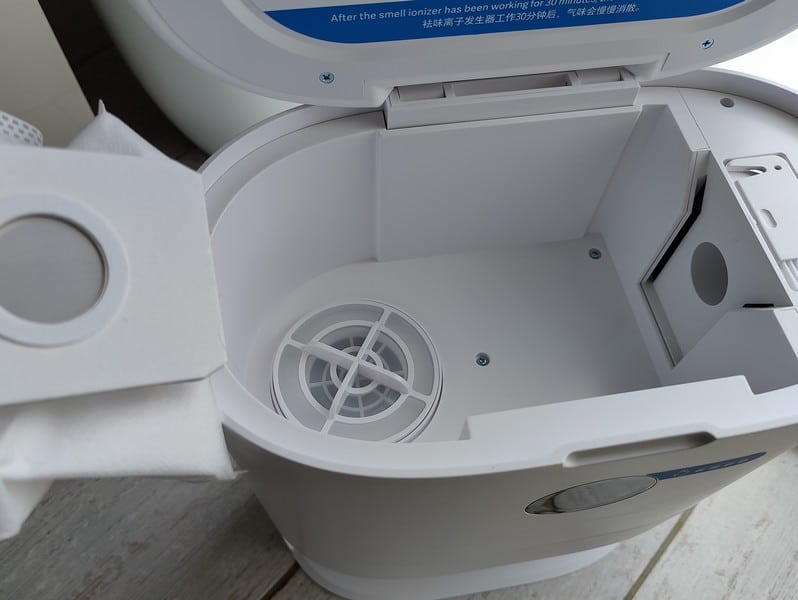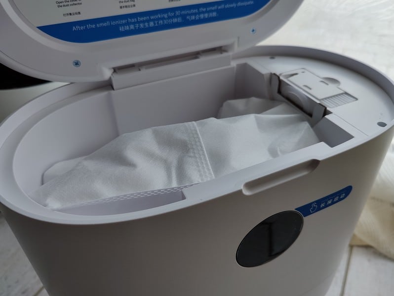Une fois le nettoyage terminé, notre Roidmi retourne à sa station pour procéder à la vidange du bac à poussière. La vidange est configurable : vous pouvez le faire à chaque nettoyage, ou tous les 2 ou 3 fois. Vous pouvez également ne jamais ramasser la poussière. Le ramassage fonctionne très bien, il dure une dizaine de secondes, un décompte s’affiche sur l’écran LED de la station. Seul inconvénient, le processus est très bruyant ! La saleté récupérée dans le sac est ensuite stérilisée et désodorisée pour éviter les mauvaises odeurs même après 60 jours. Le système est plutôt efficace, car je n’ai pas constaté de mauvaises odeurs. Un voyant sur la station vous avertit lorsque le sac est plein.