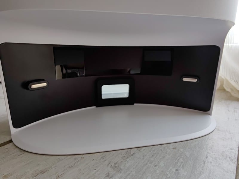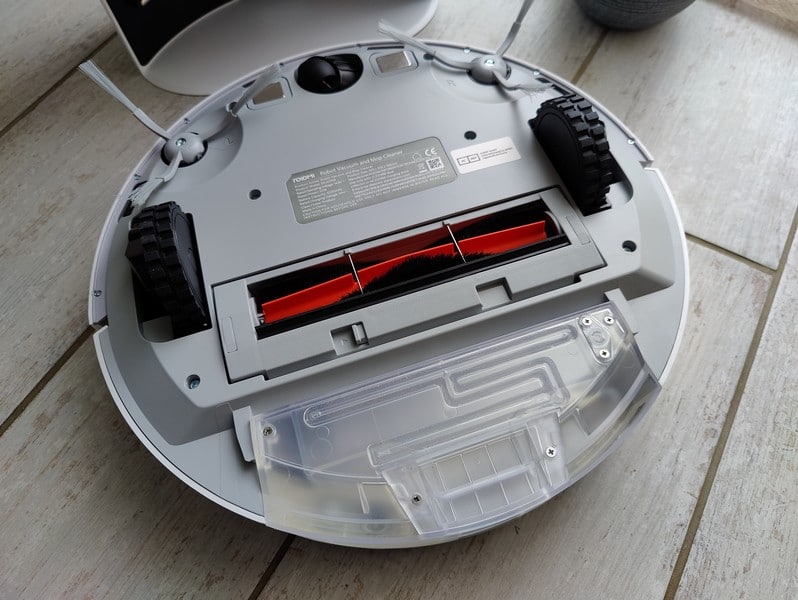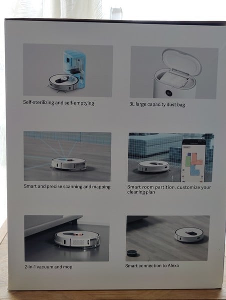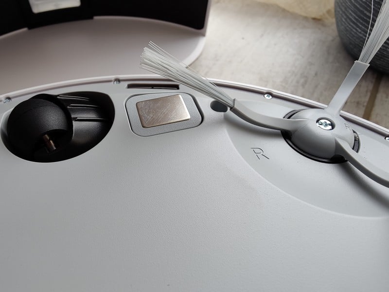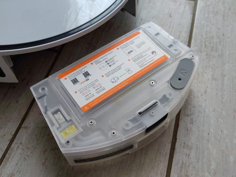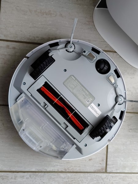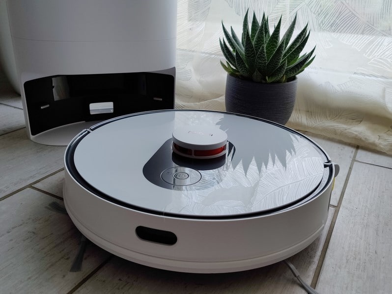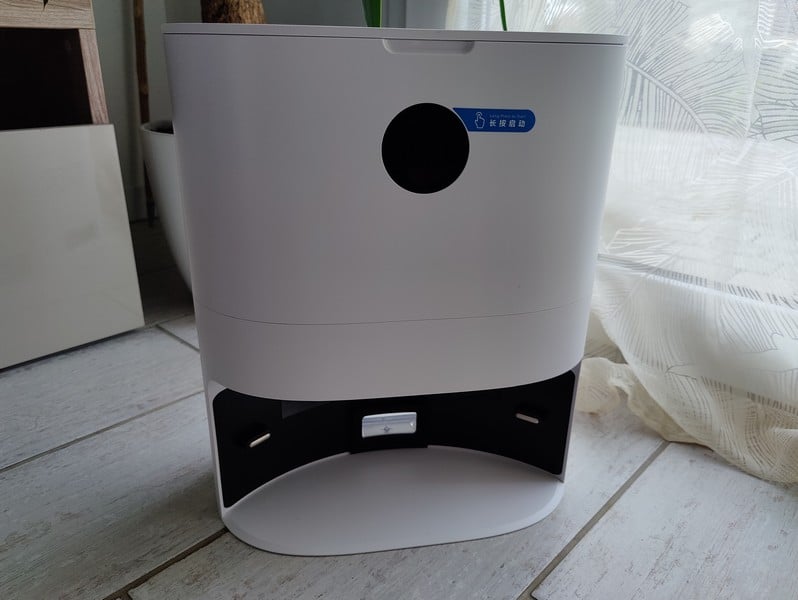 L’élément le plus voyant est le capteur de pression a tête laser dissimulant le capteur laser. Le nom de la marque est inscrit dessus en noir. Cet élément permet la navigation de l’aspirateur dans votre logement. Le désavantage est que la hauteur de l’aspirateur est impactée, l’appareil ne passe pas sous certains meubles, par contre c'est intéressant en termes de précision pour la navigation. L’avant est équipé de divers capteurs, infrarouge, détection de mur, suivi de mur (TOF). À l’arrière nous retrouvons les haut-parleurs, d’autres capteurs infrarouges, les contacts de charges et le bac à poussière qui intègre également un réservoir d’eau.