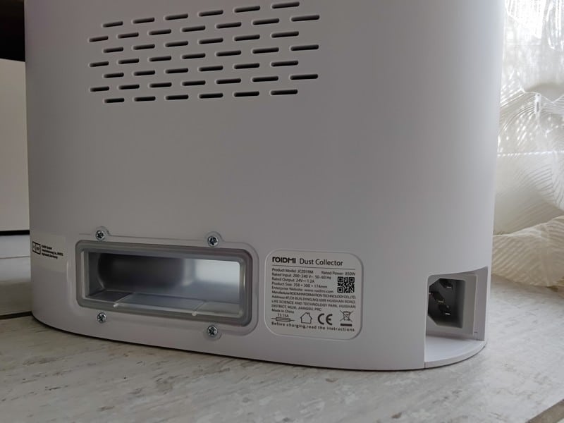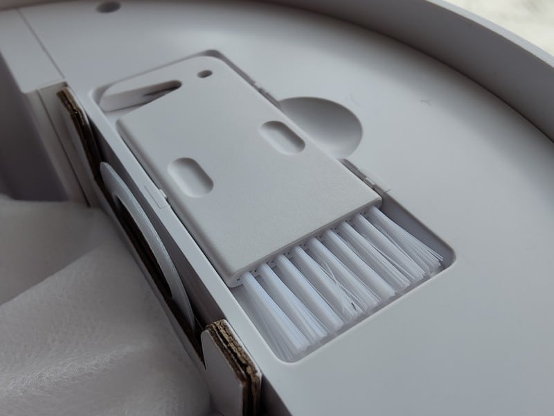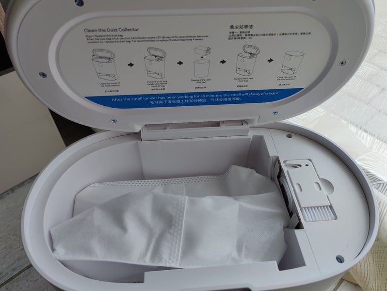 Au niveau couleur nous ne sommes pas dépaysés, c’est toujours blanc avec quelques éléments noirs comme l’afficheur LED en façade et l’emplacement de recharge de l’aspirateur. Dans ce renfoncement, il y a une lentille infrarouge, un contact de charge et l’orifice d’admission de la poussière. L'accès au sac se fait en soulevant le couvercle sur le dessus. Nous retrouvons des instructions sur l'utilisation du sac. Le sac a une contenance de 3L. Sur le côté droit se trouve la brosse de nettoyage soigneusement rangée dans son emplacement. Les derniers éléments sont situés à l’arrière avec une sortie d’air, un couvercle transparent du conduit à poussière et un port de charge.