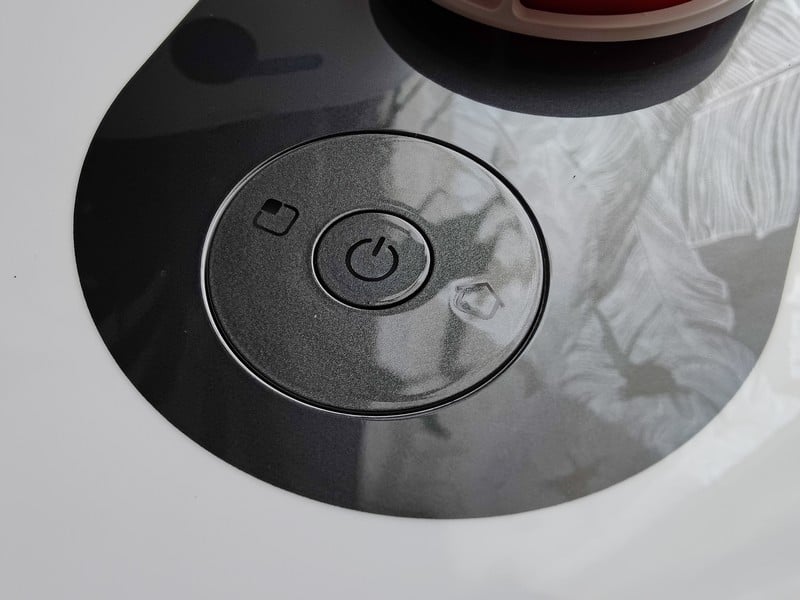 Principalement blanc, une note de noir sur le dessus permet de démarquer les boutons fonctions qui correspondent à "Endroit", "Réinitialisation", "Marche/arrêt" et "station". Le nom de ces fonctions et assez explicite sauf peut-être pour le bouton "Endroit" qui correspond au nettoyage d’une zone ponctuelle et "réinitialisation" qui permet de redémarrer l’appareil.