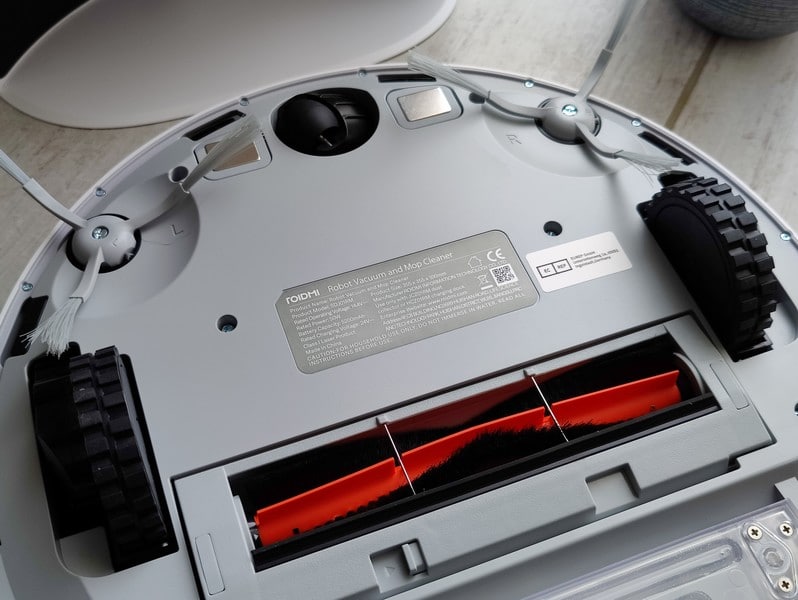 En dessous, nous avons deux roues motrices, une roue directionnelle entourée par les plaques de charges, jusque-là tout va bien. Des capteurs de bordures sont situés juste au-dessus. Sur chacun des côtés se situe une brosse latérale. Quant à la brosse principale, elle est au centre.