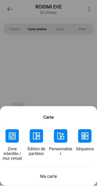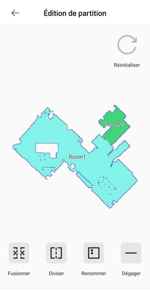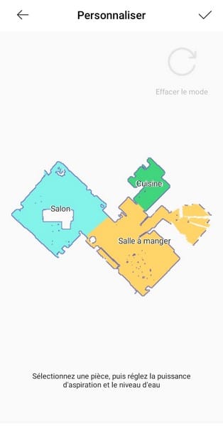 Sur la cartographie la personnalisation est complète. Nous avons la possibilité de nommer chaque zone, de les délimiter comme bon nous semble, nous pouvons également placer des murs virtuels pour bloquer le passage de l’aspirateur. Nous pouvons également modifier l’ordre de passage des pièces, si vous voulez nettoyer certaines pièces en priorité.