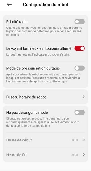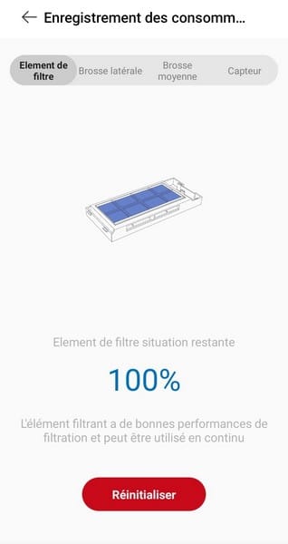 Dans les classiques, nous retrouvons l’historique de nettoyage, le niveau des consommables et la configuration de la voix et du volume, à noter que le français est disponible.