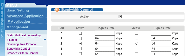 Intéressons-nous à la fonctionnalité « Bandwidth Control » qui consiste à limiter la bande passante, au niveau du trafic entrant et du trafic sortant. Pour chaque interface de l’équipement, cette fonctionnalité est configurable.