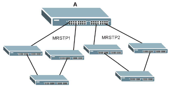 Le protocole Multiple RSTP est un protocole propriétaire ZyXEL, compatible avec RSTP et STP. Grâce au MRSTP, vous pouvez avoir plus d'une architecture Spanning-Tree sur votre switch et assigner les ports à chaque "arbre" du Spanning-Tree.