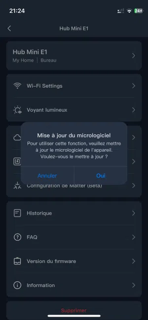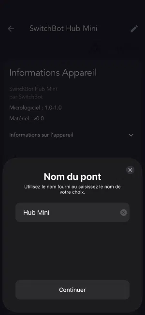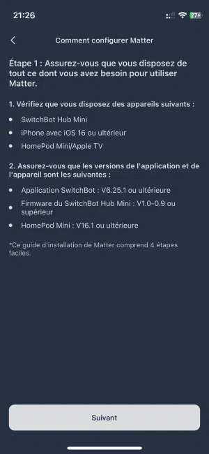 Si vous souhaitez utiliser le Hub simplement par l’application SwitchBot, vous pouvez dès maintenant configurer le Hub et les périphériques. Sinon, allez directement vérifier s’il y a une mise à jour à faire pour la mise en place de Matter. L’intégration sans la mise à jour permet dès le début de disposer des services tiers et de l’accès à distance de vos périphériques.