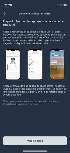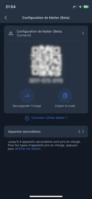 Une fois le Hub ajouté, retourner dans l’application SwitchBot, sélectionner le Hub et aller dans les paramètres. Prendre l’option « Configuration de Matter (Beta) », dans ce menu, vous retrouvez le code associé à ce périphérique pour Matter (il doit être identique à la carte et au collant disponible sur le Hub), et « Appareil secondaire », cliquer sur le second. Vous trouvez dans cette page, la liste des appareils pris en charge, en haut les appareils déjà ajoutés, en bas les appareils disponibles. Cliquer sur le + pour ajouter les appareils, attention seulement 4 appareils peuvent être associés sur le Hub Mini contre 8 pour le Hub 2).