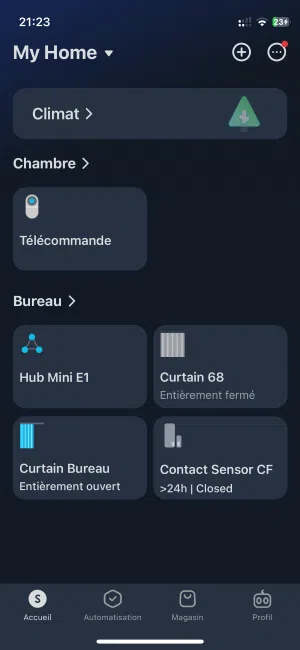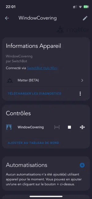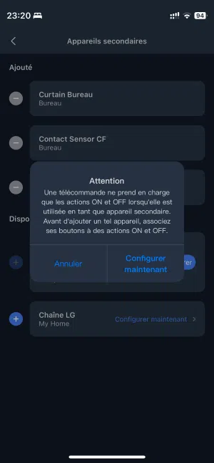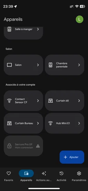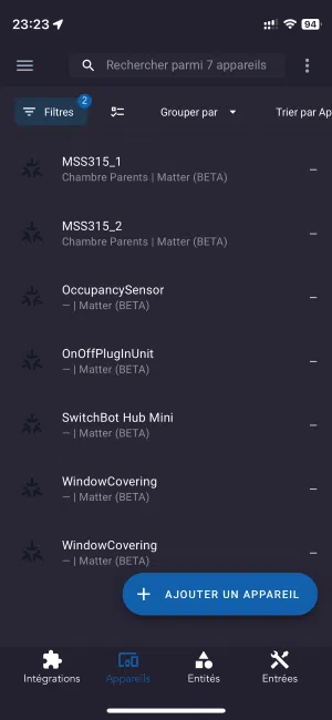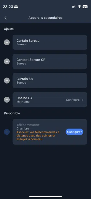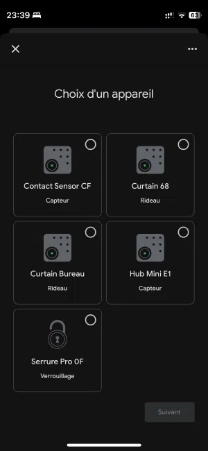 Retournez ensuite dans la partie intégration, puis Matter d’Home Assistant et les appareils précédemment ajouter dans l’application sont maintenant disponibles. Si vous avez plusieurs appareils identiques, ajoutez-les un par un afin de les renommer plus facilement. Dans les appareils compatibles (pour les appareils que nous avons testés), vous retrouvez : la serrure Lock Pro, les poussoirs Curtains 3, la télécommande Remote, la télécommande ajoutée dans le module IR (Mode On/Off seulement).