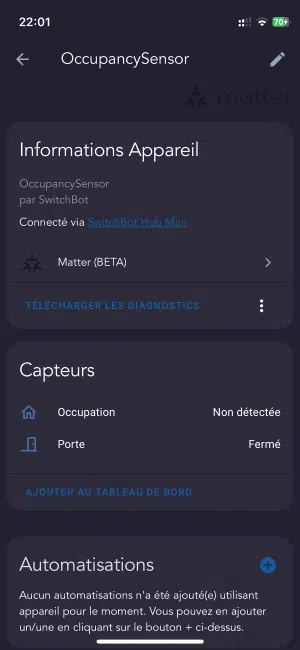 Pour les tests, l’intégration Matter a été faite avec Home Assistant (disponible si la mise à jour du Hub a été faite), allez dans Home Assistant, paramètres puis appareils et services. Dans l’onglet appareils, cliquer sur ajouter un appareil, sélectionnez « Ajouter un appareil Matter » et à la question « Est-il déjà associé …… » répondez oui ou non suivant votre cas (documentation Home Assistant).