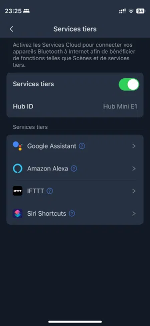 Afin de mettre en fonction le Hub et d’activer le fonctionnement à distance avec les différents périphériques déjà intégrés dans l’application, accédez à la page de détail d’un périphérique en touchant l’icône du tableau de bord et l’application signale automatiquement l’ajout d’un Hub. Si ce n’est pas le cas, accéder au menu paramètres puis aux services tiers afin de les activer.
