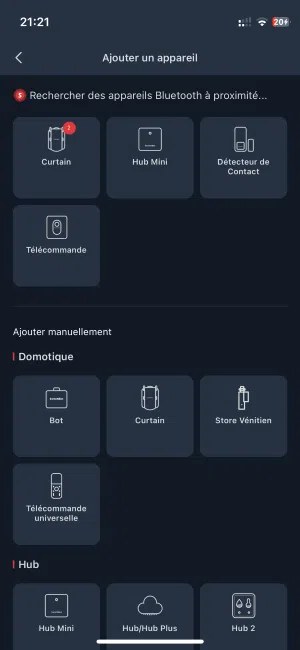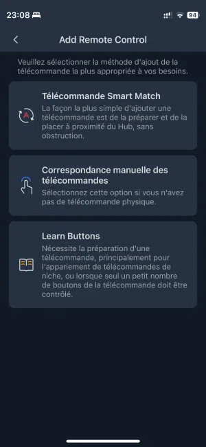 Pour ce faire, accéder à la page détail du Hub puis ajouter une télécommande. L’application propose une liste de type de périphériques puis l’accès aux différents modes d’apprentissage (3 modes proposés).