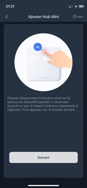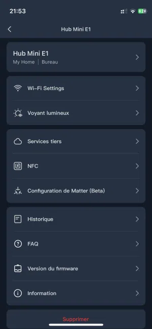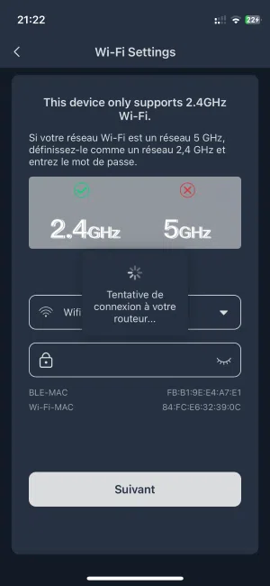 Le Hub s’ajoute à l’application comme tous les autres périphériques fournis par la marque. Une fois la mise en alimentation effectuée, cliquer sur le bouton + d’ajout de périphériques, celui-ci est automatiquement détecté. Si ce n’est pas le cas, appuyer 3 secondes sur le bouton de réinitialisation afin de lancer l’appairage. Lors de l’appairage, une page sur la compatibilité wifi s’affiche qui rappelle l’information fournie dans les spécifications soit qu’un Wifi à 2.4 Ghz est nécessaire. Puis, vous accédez au paramétrage du wifi et aux paramètres du Hub une fois l’intégration effectuée.